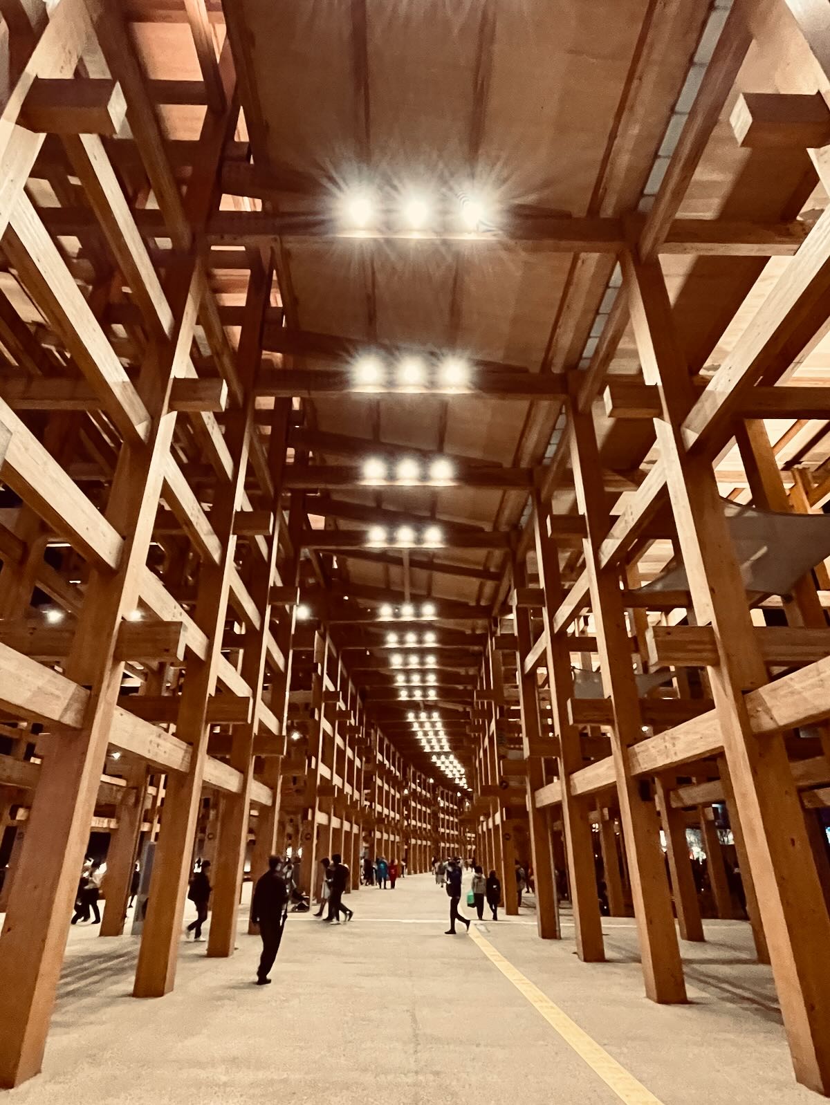 The Wooden Ring of the Osaka Expo 2025. We visited they expo on its opening day, and while the crush at the entrance was considerable, the expo was actually still not as busy as much later during its run. After the sun had set, the stunning wooden ring was nearly deserted.