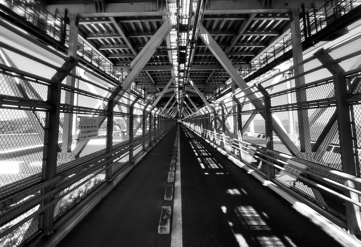 Innoshima Bridge. The bike path under the roadway of the bridge connecting Innoshima Island with Mukaishima Island near Onomichi.