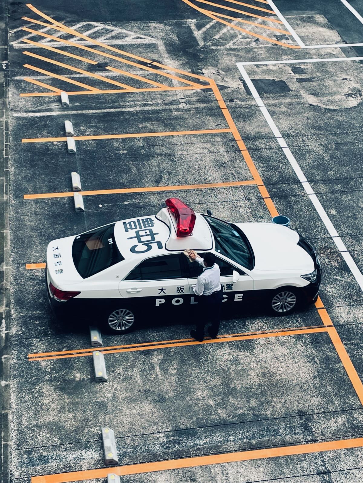 Keeping It Tidy. A Osaka policeman taking care of his ride while on a break at the Osaka Itami airport.