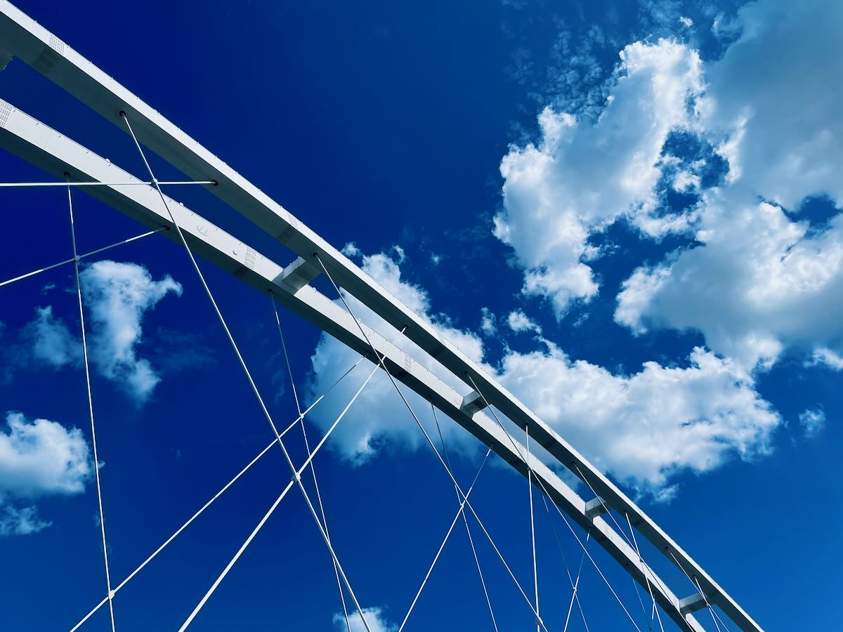The soaring span of the Torikai Ohashi Bridge across Yodogawa River in Osaka. The city has a multitude of interesting bridges across its many waterways, many of them combining train and vehicle traffic.