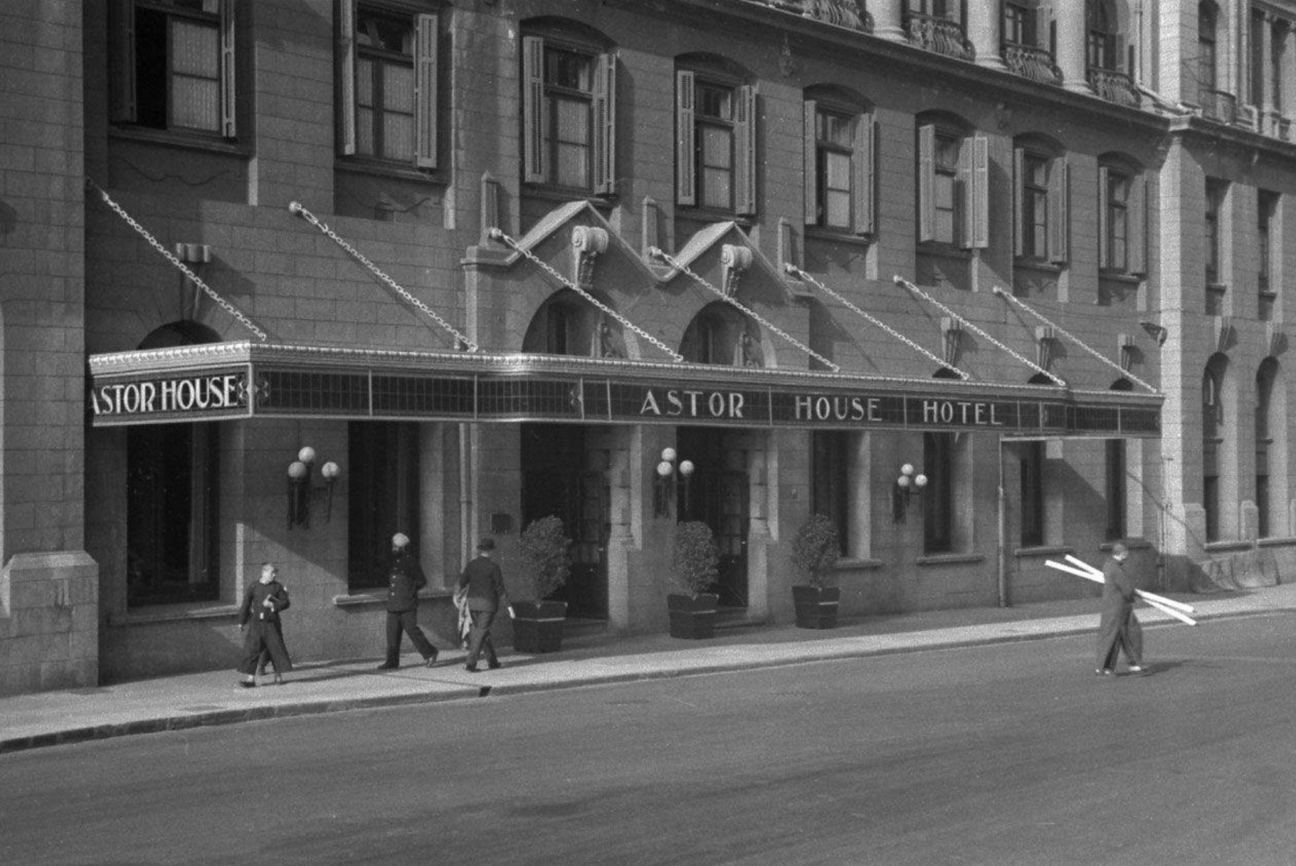After the renovation of the hotel in 1911 it sported a smaller cantilevered canopy for a decade. Sometime in the early 1920s, this was replaced with the very expansive canopy with the name "ASTOR HOUSE HOTEL" in large letters in a very Art Deco type. The "A" in the type had a rather jauntily angled crossbar as can be seen in this gorgeous photo from around 1925.