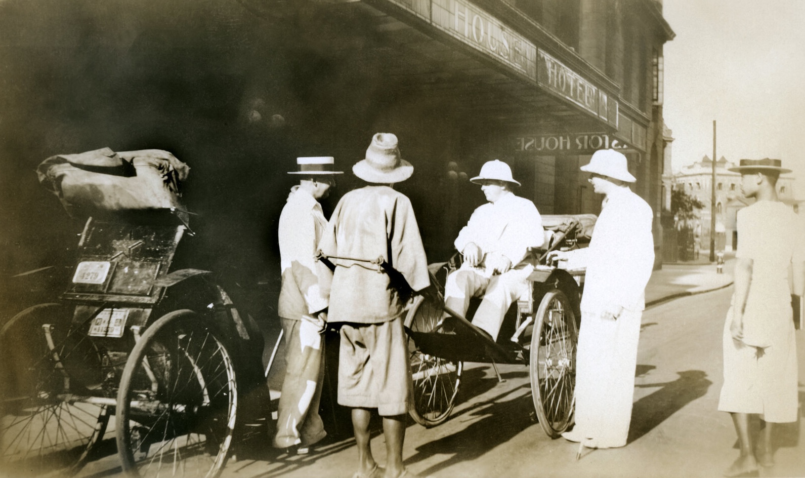 Here we see guests arriving by rickshaw on a summer evening in 1933 with the gorgeous awning in a rare close-up view. This photo is of remarkable quality and clarity for the time and it was taken with some care - it makes me wonder if one of these men is somebody famous.